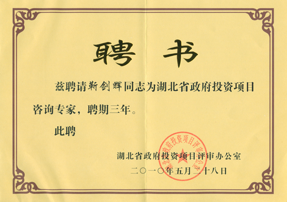 2010年6月17日,靳剑辉、刘勋涛、张曙东被聘为湖北省政府投资项目咨询专家